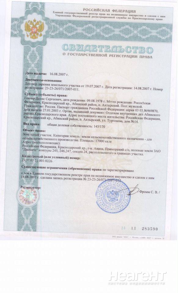 Продаю участок площадью 170 сот. Продаётся земельный участок сельскохозяйственного назначения площадью 1,7 га. Адрес: Краснодарский край, г-к Анапа, ЗАО «Джемете», секция 24, часть контура ...