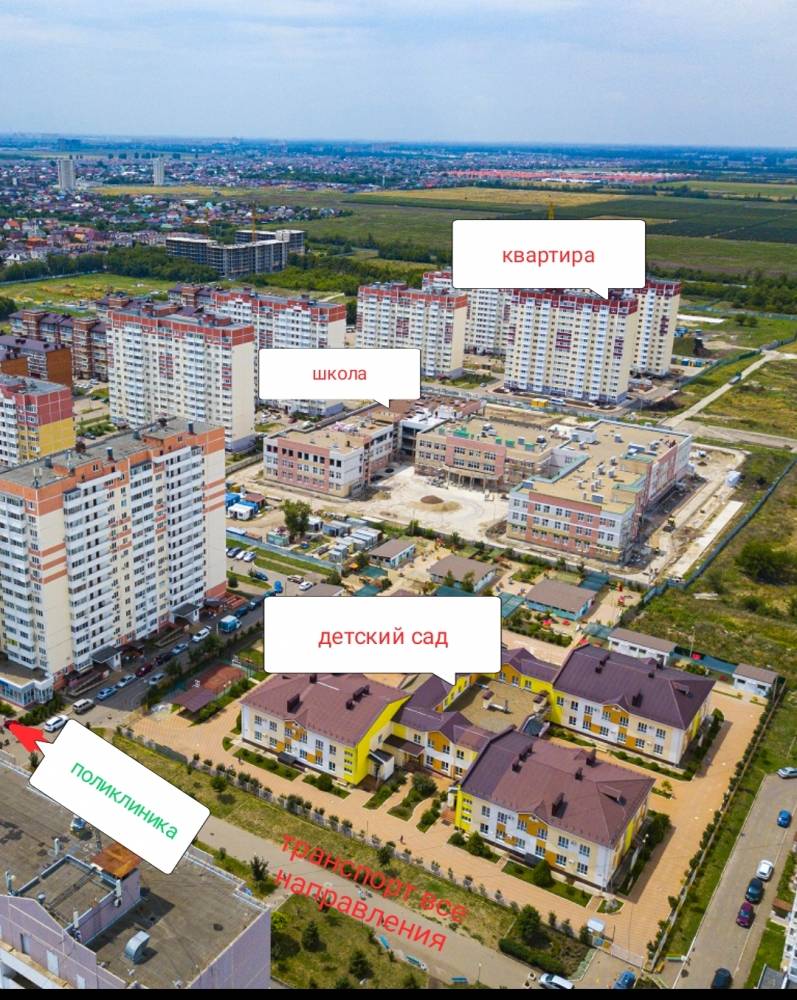 Вблизи детский сад, школа. Через дом - конечная маршрутки на Кооперативный рынок по Дзержинского. Тургенева. Рядом также электричка на автовокзал Краснодар-1. Краснодар-2, рынок Вишняковский. Ряйон на ветке Ейского шоссе - транспорт в любую точку города. В микрорайоне есть все необходимые сетевые магазины и пункты выдачи заказов. Рынок.