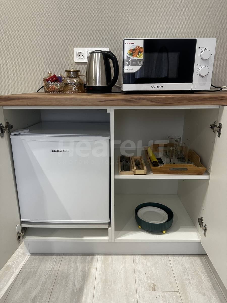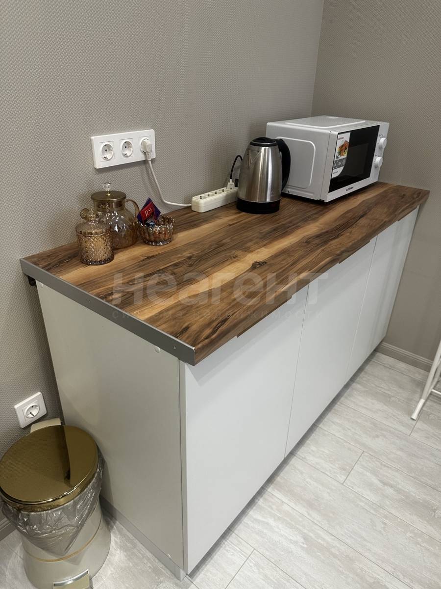 В комнате ламинат, в санузле керамогранит. Стены крашенные обои, всегда можно перекрасить. В санузле выведено под бойлер на летние выключения горячей воды (см. фото). В кухонной зоне выведены трубы под мойку (см. фото), осталось вырезать на столешнице под раковину и поставить смеситель, фартук. Я это не стала делать, так как мне не нужно. Но все выведено заблаговременно.