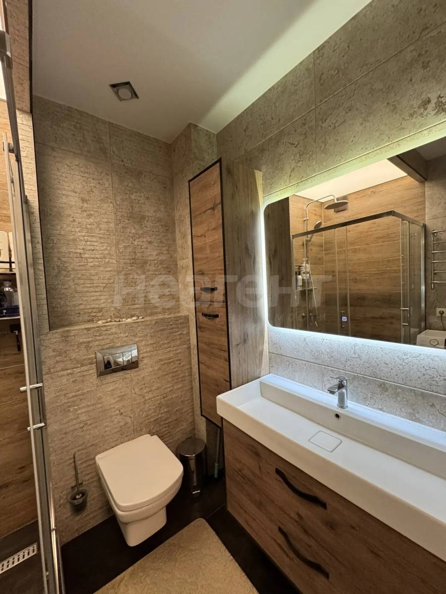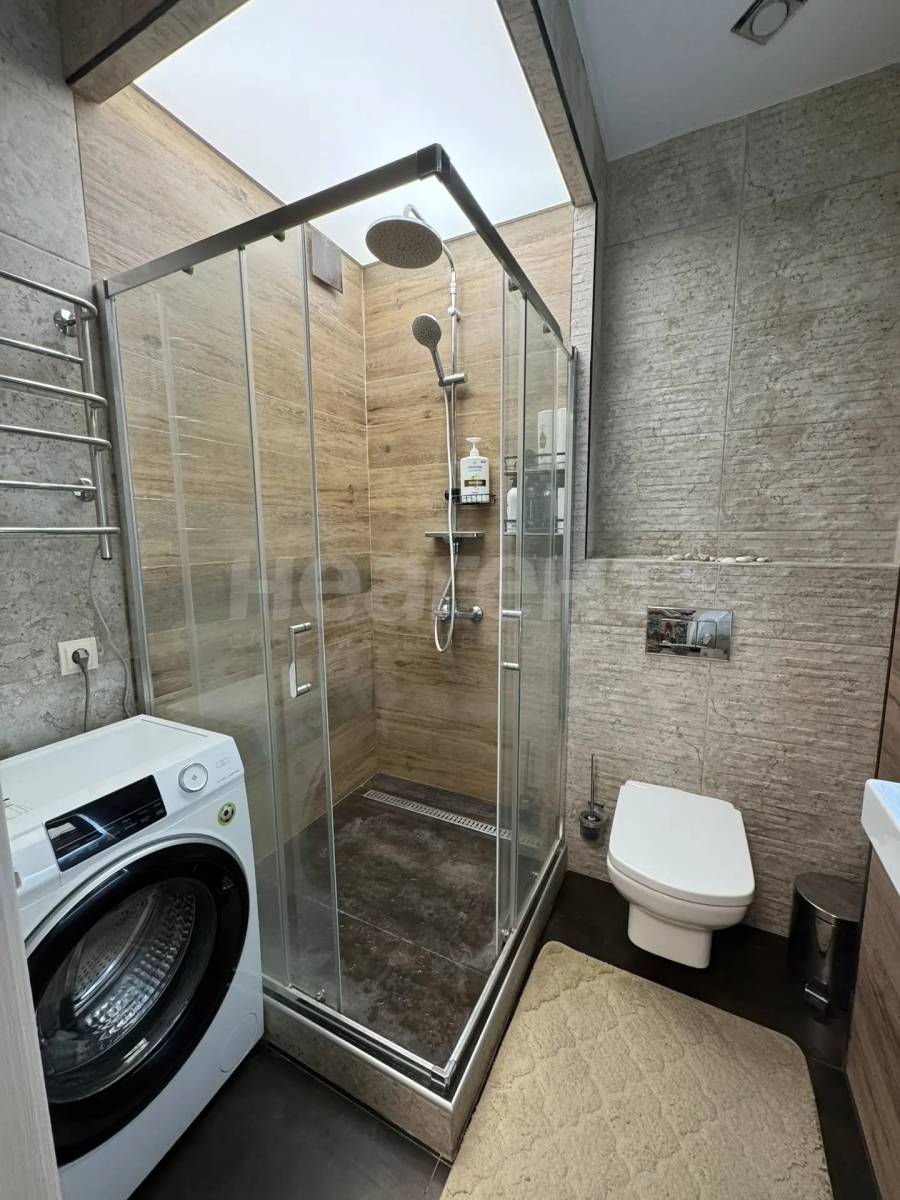 Совмещенный санузел выполнен в светлых тонах и оснащен душевой кабиной. В прихожей предусмотрены вместительные шкафы для хранения вещей.