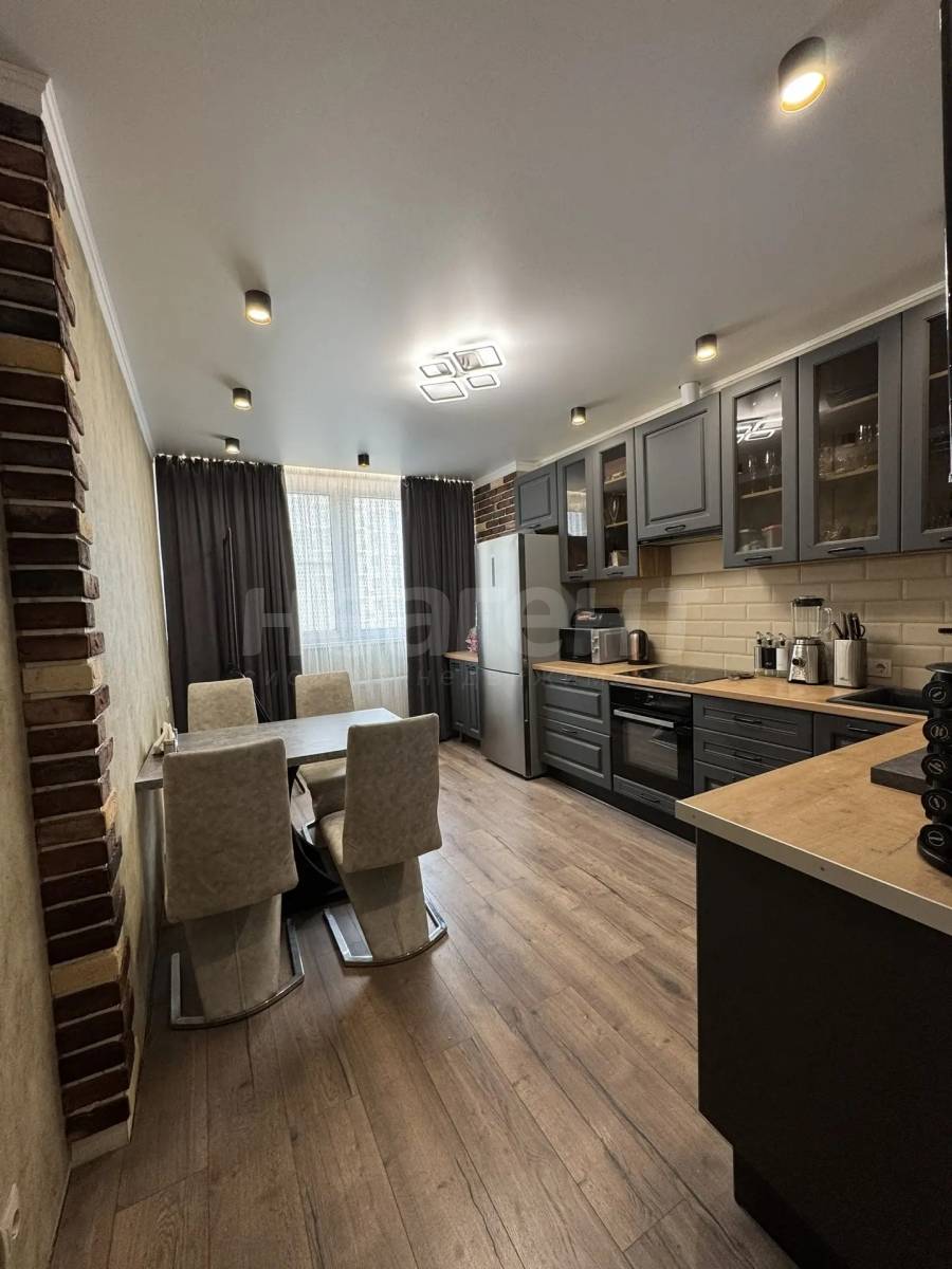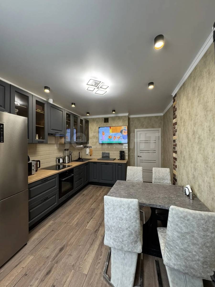 Кухня оборудована современной техникой, включая холодильник.