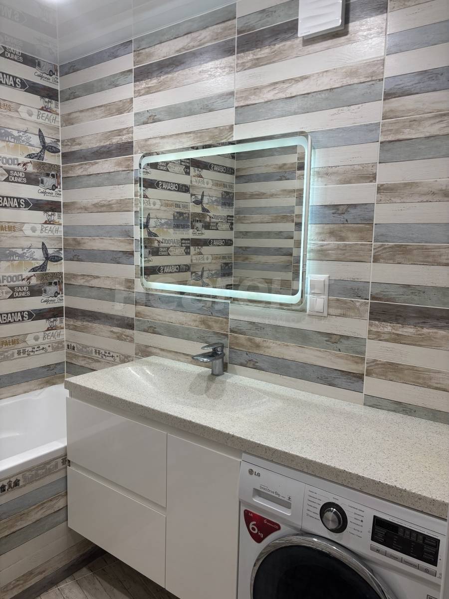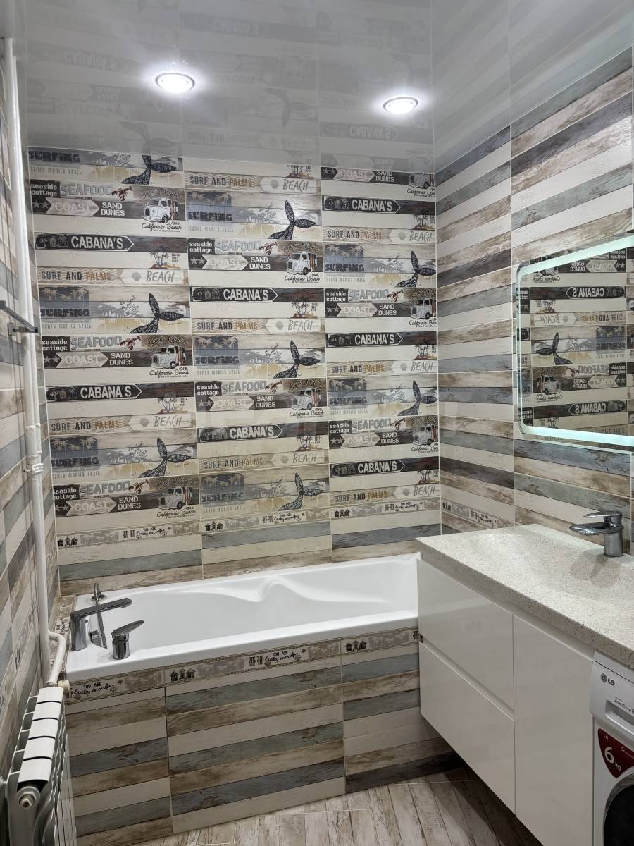 Ванна и туалет раздельные в плитке, качественная сантехника, в ванной столешница из искусственного камня