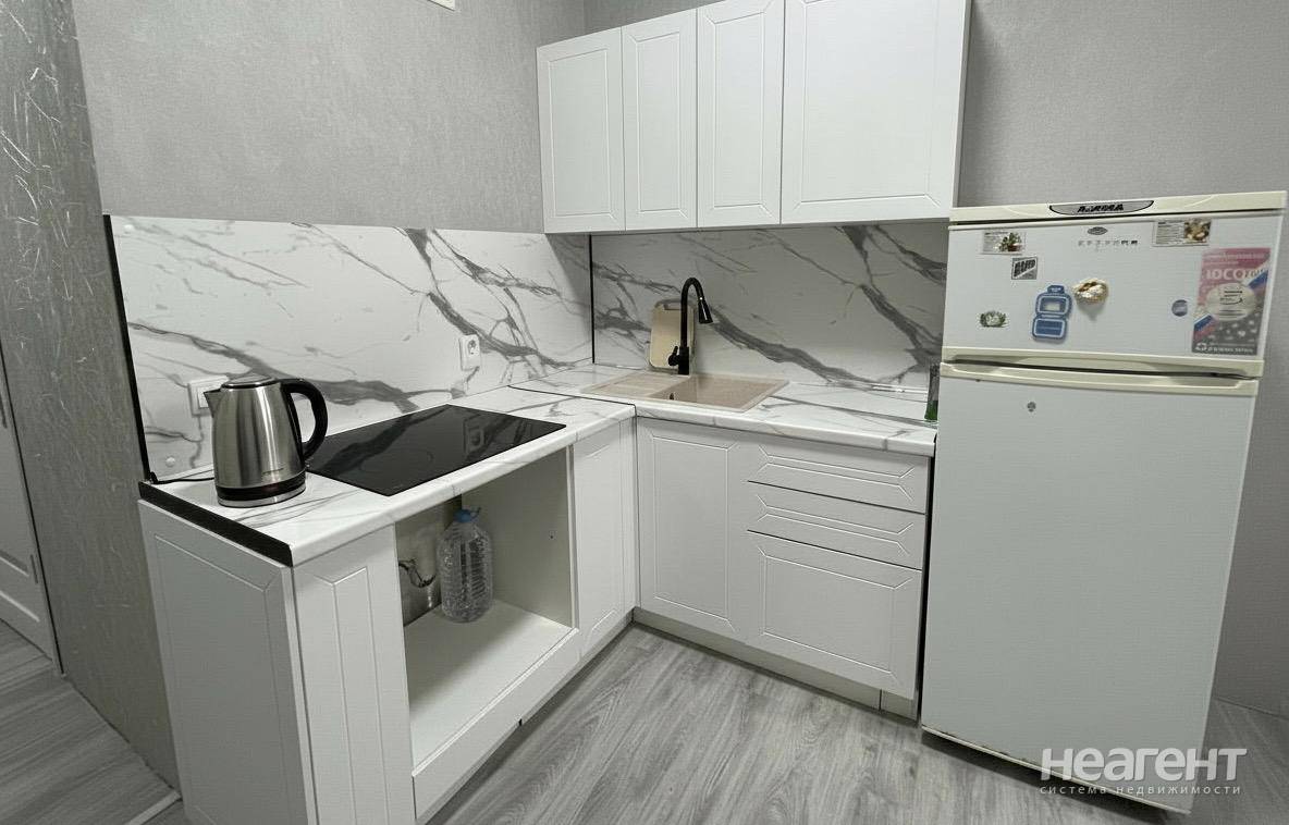 Квартира в ЖК «Жемчужина», 32 кв. м с новым ремонтом. 5 этаж, 10 мин. до трамвая пешком. Кухня-гостиная: Современный кухонный гарнитур, обеденный стол, плита, холодильник, телевизор, микроволновка ...