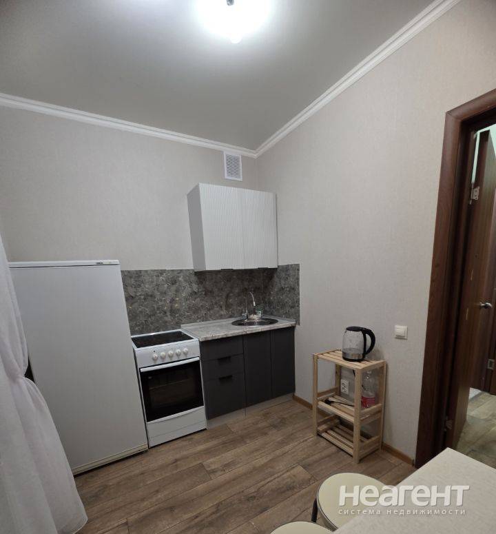 Квартира в ЖК «Жемчужина», 32 кв. м с новым ремонтом. 5 этаж, 10 мин. до трамвая пешком. Кухня-гостиная: Современный кухонный гарнитур, обеденный стол, плита, холодильник, телевизор, микроволновка ...