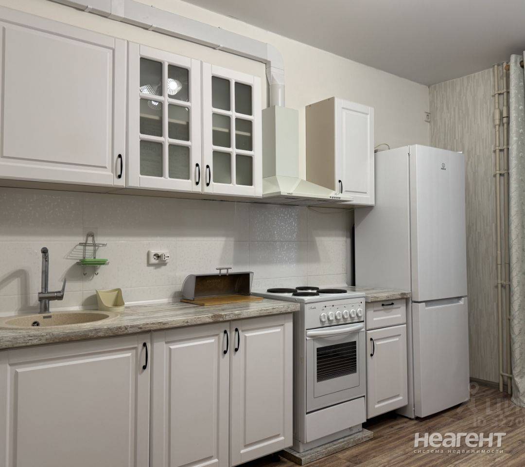 Квартира в ЖК «Жемчужина», 32 кв. м с новым ремонтом. 5 этаж, 10 мин. до трамвая пешком. Кухня-гостиная: Современный кухонный гарнитур, обеденный стол, плита, холодильник, телевизор, микроволновка ...