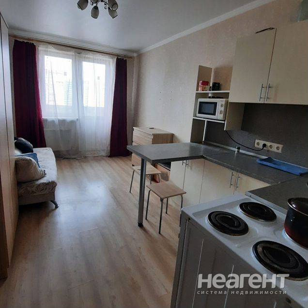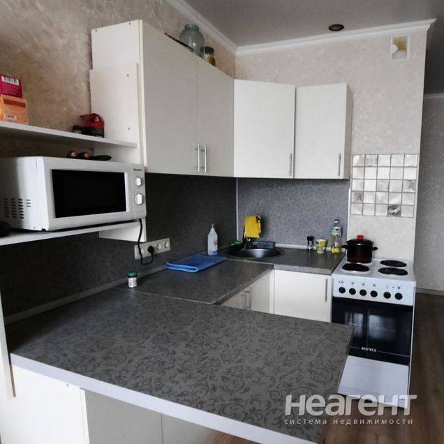 Квартира в ЖК «Жемчужина», 32 кв. м с новым ремонтом. 5 этаж, 10 мин. до трамвая пешком. Кухня-гостиная: Современный кухонный гарнитур, обеденный стол, плита, холодильник, телевизор, микроволновка ...
