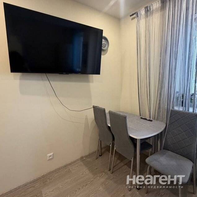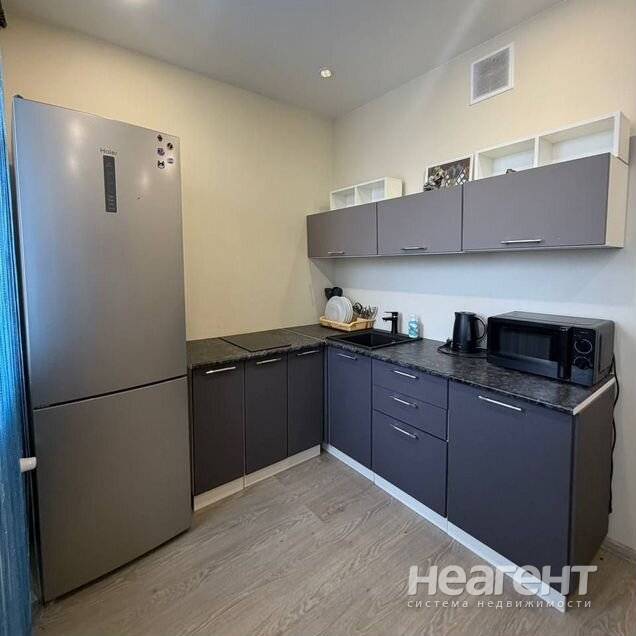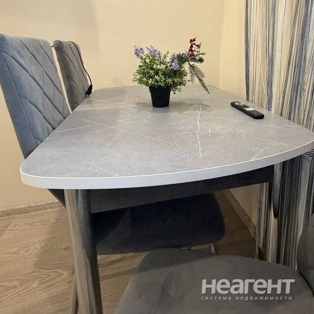 Квартира с евроремонтом в новом доме, построенном в 2023 году. На кухне и в комнате установлена мебель, а также современная бытовая техника: кондиционер, холодильник, телевизор и стиральная ...