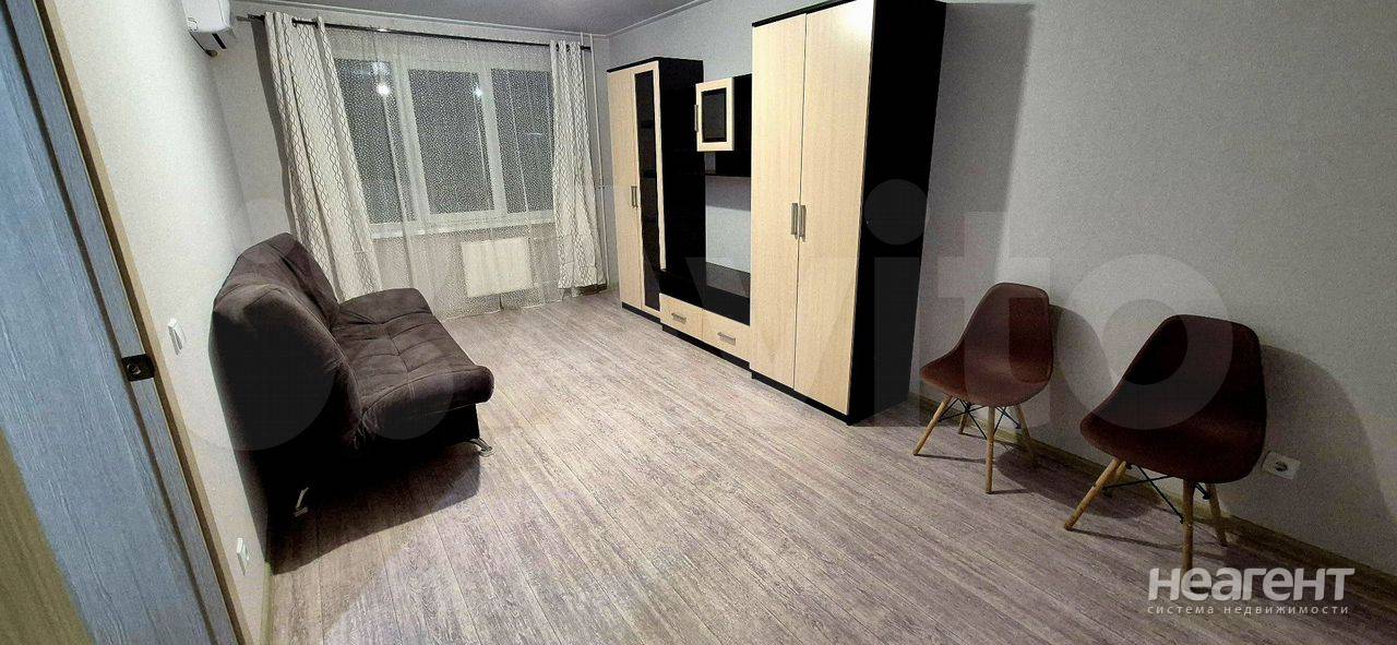Квартира с евроремонтом в новом доме, построенном в 2023 году. На кухне и в комнате установлена мебель, а также современная бытовая техника: кондиционер, холодильник, телевизор и стиральная ...