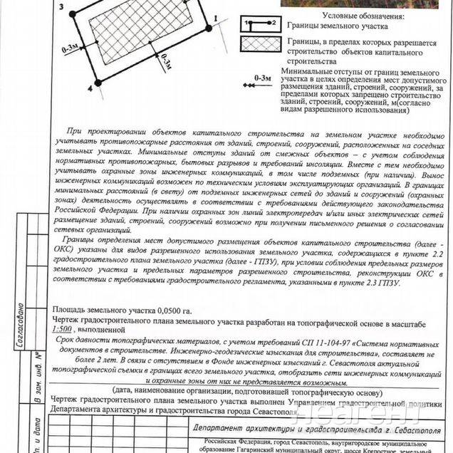 Продаю участок площадью 5 сот. Только прямая продажа от собственника. Продается земельный участок правильной прямоугольной формы 5 сот. между Казачьей бухтой и Фиолентом (c участка можно выехать и туда, и туда). Размер участка 28 х17. Есть небольшой уклон. Участок видовой. 5 минут пешком до остановки общественного транспорта и магазина. Вокруг почти все участки застроены, живут люди. 10 минут до моря. Также от ближайшей остановки в 5 минутах езды в Казачьей бухте школа, детский сад, новая поликлиника, магазины, рынок. В другую сторону в 10 минутах торговый центр, парки, сады, школы, вся необходимая инфраструктура. Из коммуникаций: свет подключен 15 кВт; вода - можно сделать скважину (около 70 м); газ - ведут к участку (договор заключен, оплачено), до конца года скорее всего подведут к участку. Есть гпзу с пятном застройки. Кадастровый номер: 91:02:005006:1190. Адрес: Крепостное шоссе, 31/13 а. Вид разрешенного использования: Ведение садоводства (код 13.2) - с возможностью строительства жилого дома и регистрацией. По Генеральному плану предусмотрено появление автомобильной дороги, соединяющей Фиолент и бухту Казачью (в процессе строительства). Согласно приказу Министерства Культуры РФ участок относится к зоне обороны и безопасности. На сегодняшний день. Министерством культуры Российской Федерации принят Акт государственной историко-культурной экспертизы научно-проектной документации, необходимой для внесения изменений в приказ Минкультуры России от 12.08.2016 № 1864. Об утверждении требований к осуществлению деятельности и градостроительным регламентам в границах территории объекта культурного наследия федерального значения достопримечательное место Древний город Херсонес Таврический и крепости Чембало и Каламита, расположенного в городе Севастополе, согласно которому будет предусмотрено строительство объектов капитального строительства. Ориентировочный срок внесения изменений в Приказ № 1864 сентябрь-октябрь 2025 года. После принятия изменений стоимость будет увеличена до 4.5 млн руб. Пока стоимость такая. По требованию все документы будут предоставлены, в том числе ответы Департамента архитектуры и градостроительства.