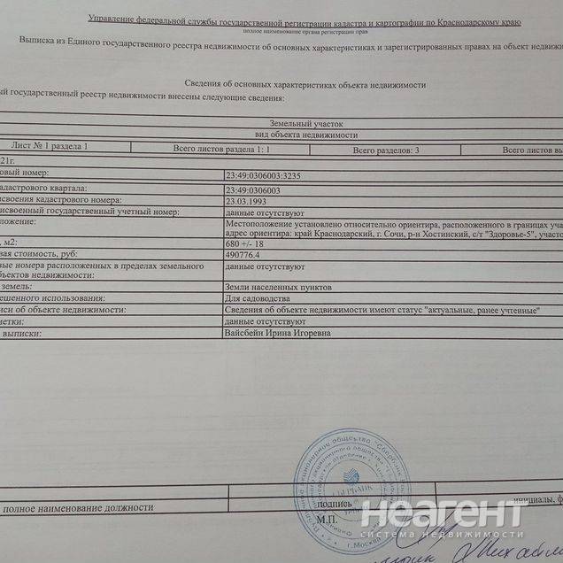 Продаю участок площадью 7 сот. Продается Участок 6.8 соток в живописном месте с потрясающим видом на горы, чистейший воздух, граничит с лесом. По сезону собираем грибы, ежевику, рядом чайные плантации и речка, прогулки на Ореховские водопады. До моря на машине 20-30 минут, природа просто мечта. Можно разбить сад, плодовые деревья уже растут - хурма, фейхоа, киви, яблоки и т. д. Имеется деревянное строение, можете использовать на ваше усмотрение. На газ уже принимают заявления. В перспективе. Собственник, кадастровый номер 23:49:0306003:3235.