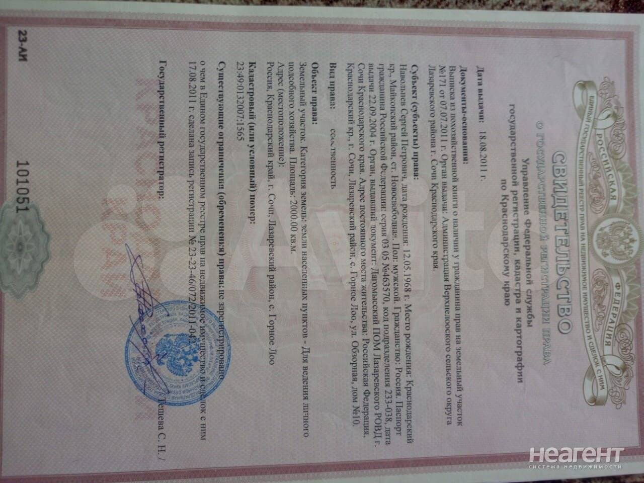 Продаю участок площадью 20 сот. Продаю участок в Горном Лоо 30 соток ЛПХ вода на участке центральная свет и газ по меже находится в центре села детсад и магазины в 200 метрах Магнит 250 метров дом Культуры 250 метров остановка 300 метров школа 500 метров полный пакет документов есть межевание и град план до моря ж. д. и авто вокзала 2 км до Сочи 20 км.