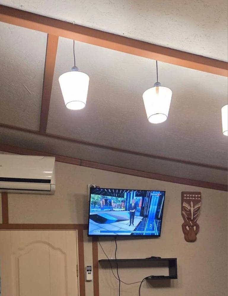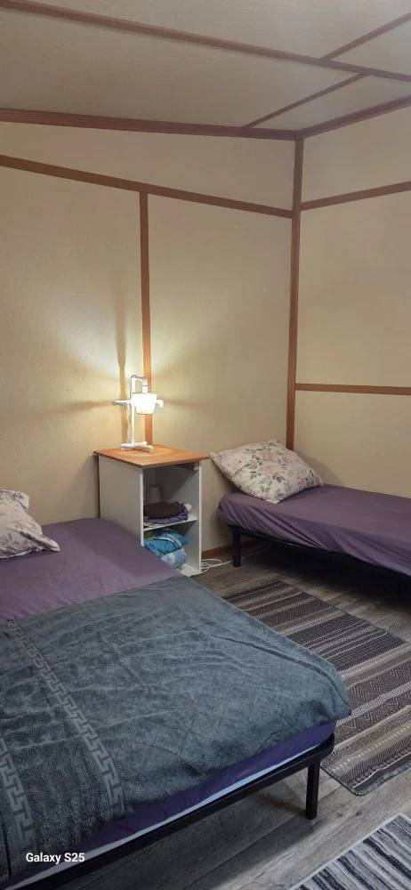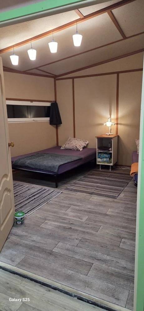 Полностью оборудованная кухонная зона с кухонным гарнитуром и раковиной: холодильник, стеклокерамическая плита с 2 зонами нагрева, микроволновая печь, электрический чайник, набор посуды ...
