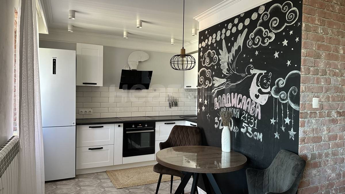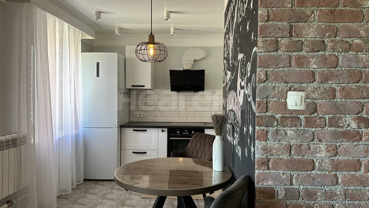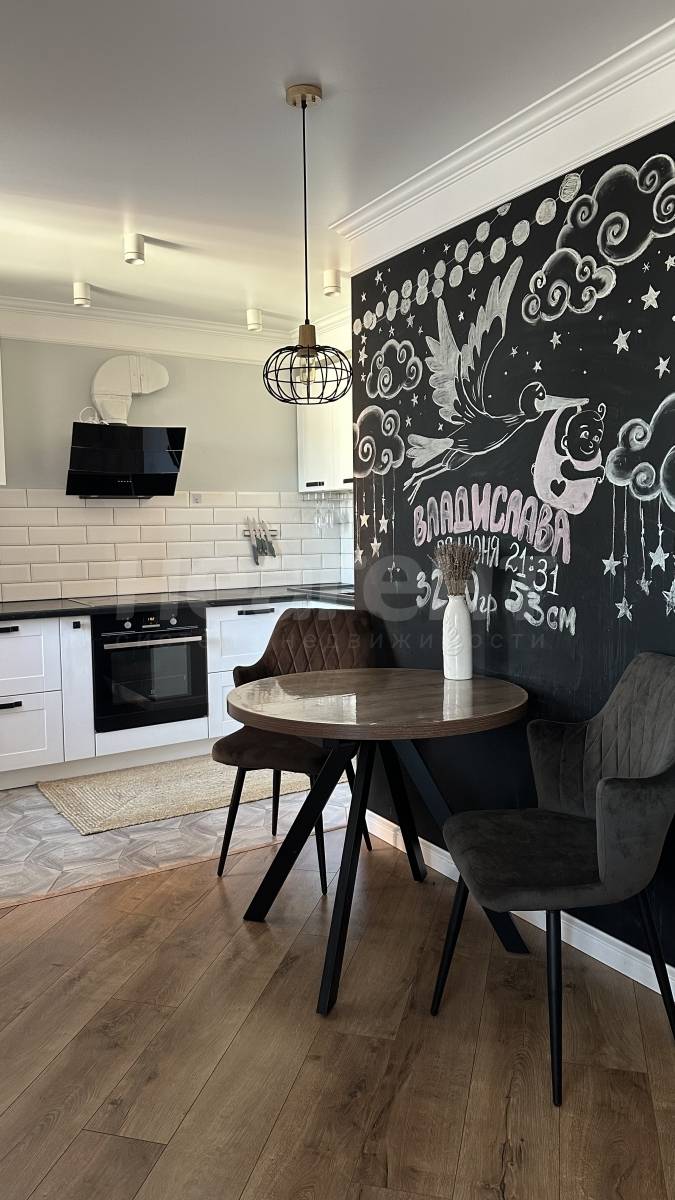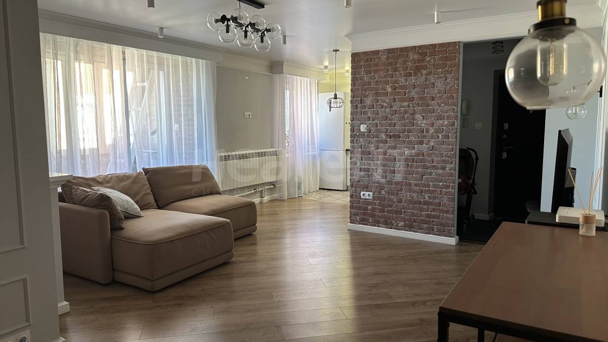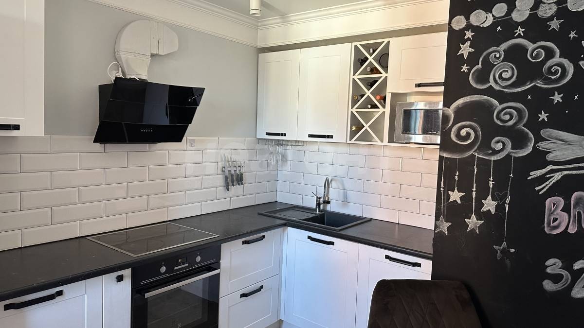 Ремонт выполнен в спокойных тонах, по дизайн проекту в стиле классика-лофт. Новым жильцам останется встроенная мебель, освещение, кухонный гарнитур с вытяжкой.