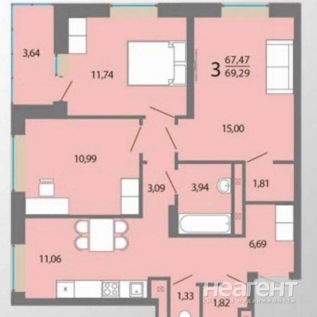 Продаю 3-х комнатную квартиру площадью 67,4 кв. м на 11 этаже 15 этажного монолитного дома. Светлая и теплая трехкомнатная квартира с застекленным балконом и двумя подсобными помещениями, которые по желанию можно использовать как гардеробные. Квартира не обжитая, мебель как временный вариант. На стенах обои, пол - линолеум, потолки натяжные - от застройщика. Жилая площадь 37,7. Фото планировки взято с похожей квартиры, меньшей площадью Общая площадь квартира 67,4. С агентствами УЖЕ сотрудничают.