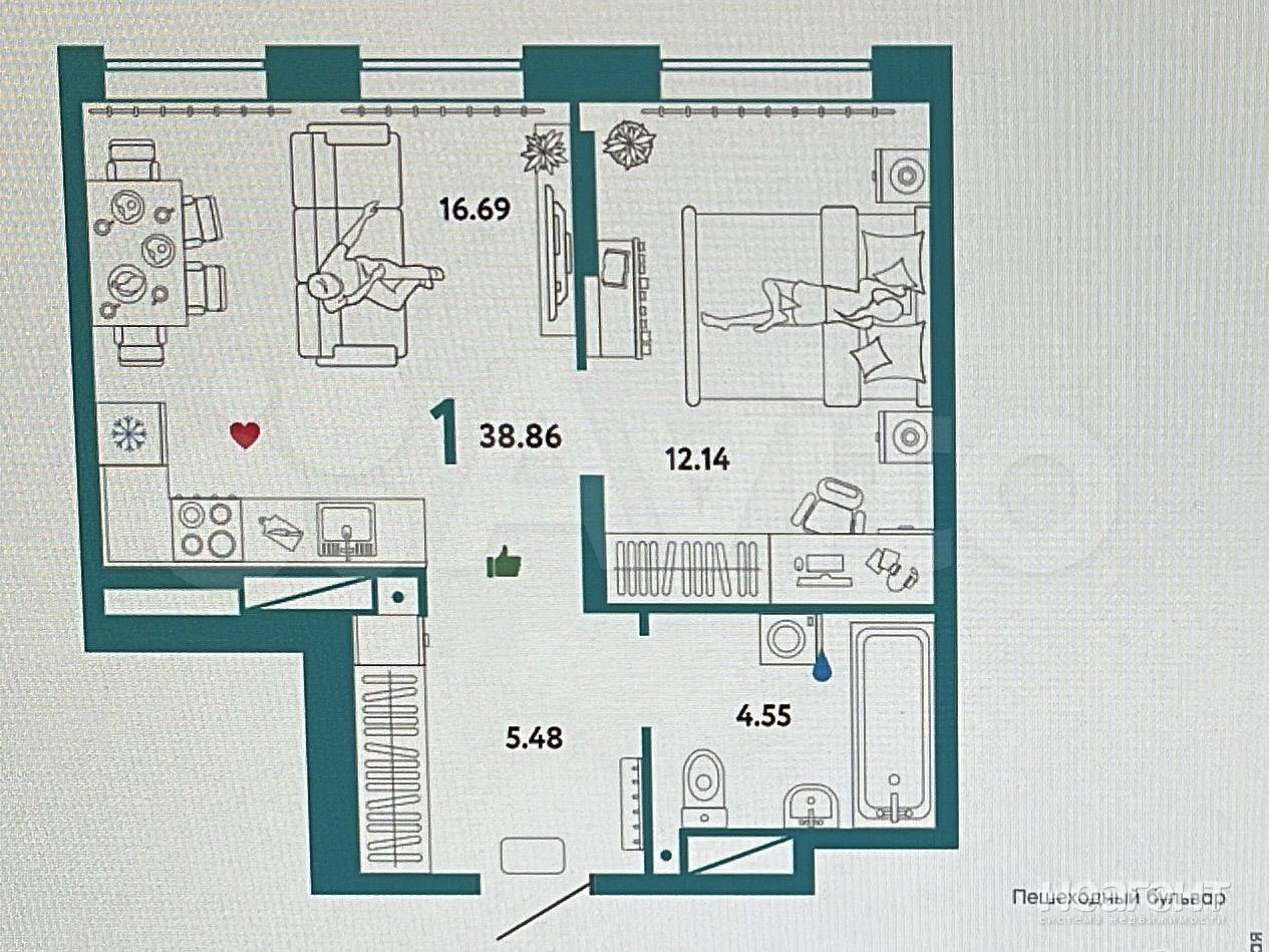 Большая комната кухня-гостиная с балконом (33,8 + 6 кв) в развивающемся районе.